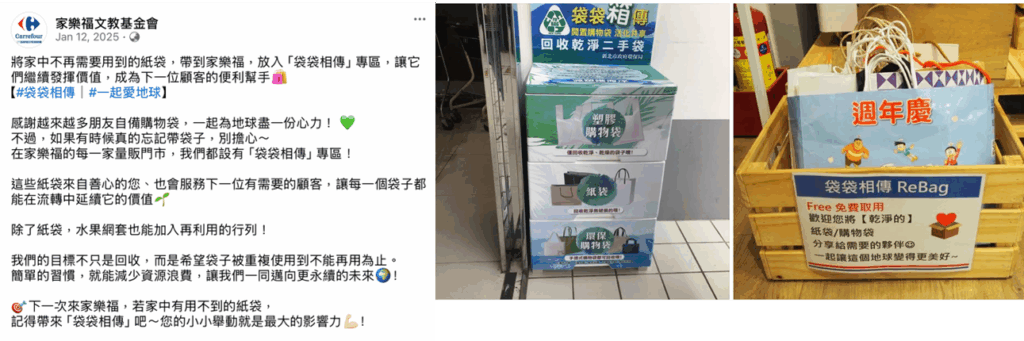 在全球零售業中,越來越多品牌透過永續贈品策略重塑與消費者的互動。例如:國際零售通路商-家樂福在推行塑膠袋減量後,提供以rPET或rPP製成的環保購物袋作為加價購贈品或會員獎勵。同時,他們也提供袋袋相傳專區,透過紙袋或水果網套的重複使用讓一次性塑膠袋的使用量減少,符合循環經濟理念。